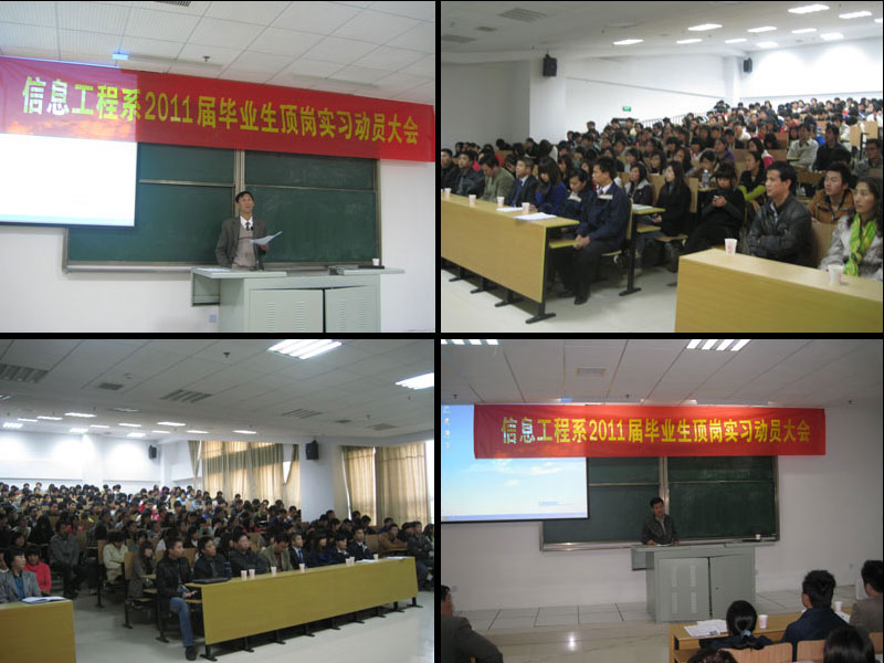 为进一步推动顶岗实习教学工作的制度化和规范化建设,搭建服务平台,帮助学生理性选择实习岗位,信息工程系于11月10日下午在应天校区教学楼201阶梯教室召开了“2011届毕业生顶岗实习动员大会暨企业现场招聘会”。
