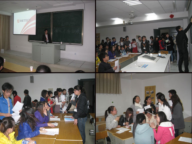 顶岗实习动员会后,参加本次会议的苏州西门子电器有限公司、统宝光电(南京)有限公司和镇江荣德新能源科技有限公司的招聘专员,依次对各自企业作了较详细的招聘宣传,并公布了此次招聘的岗位与人数。在招聘宣传中,企业对同学们较为关心的工作时间、住宿、伙食、交通、津贴、工资、福利等方面作出了明确说明。从企业代表的发言中,我们可以看出企业非常重视和支持这次“企业-学生-学校”三方的面对面活动,并期待和欢迎我校有更多的学生能够选择他们,到他们企业去实习、就业。企业的招聘宣传深深吸引了我们的学生,现场气氛热烈、高潮迭起,整个会议过程没有一个学生中途退场。此外,招聘现场还吸引了我校财经系、公管系、外语系等50多名学生前来应聘。