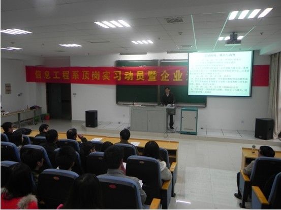为促进2013届毕业生实习工作的顺利开展,强化实习管理,确保实习质量,2012年11月16日下午,信息工程系在阶梯教室203召开2013届毕业生顶岗实习动员大会暨企业进校招聘会。会议由信工系副主任余宁主持,信工系主任束正煌、教研室主任、毕业班班主任、辅导员和来自南京洛普、LG乐金显示、苏州迅达电梯等十余家企业代表以及2013届全体毕业生出席了本次大会。