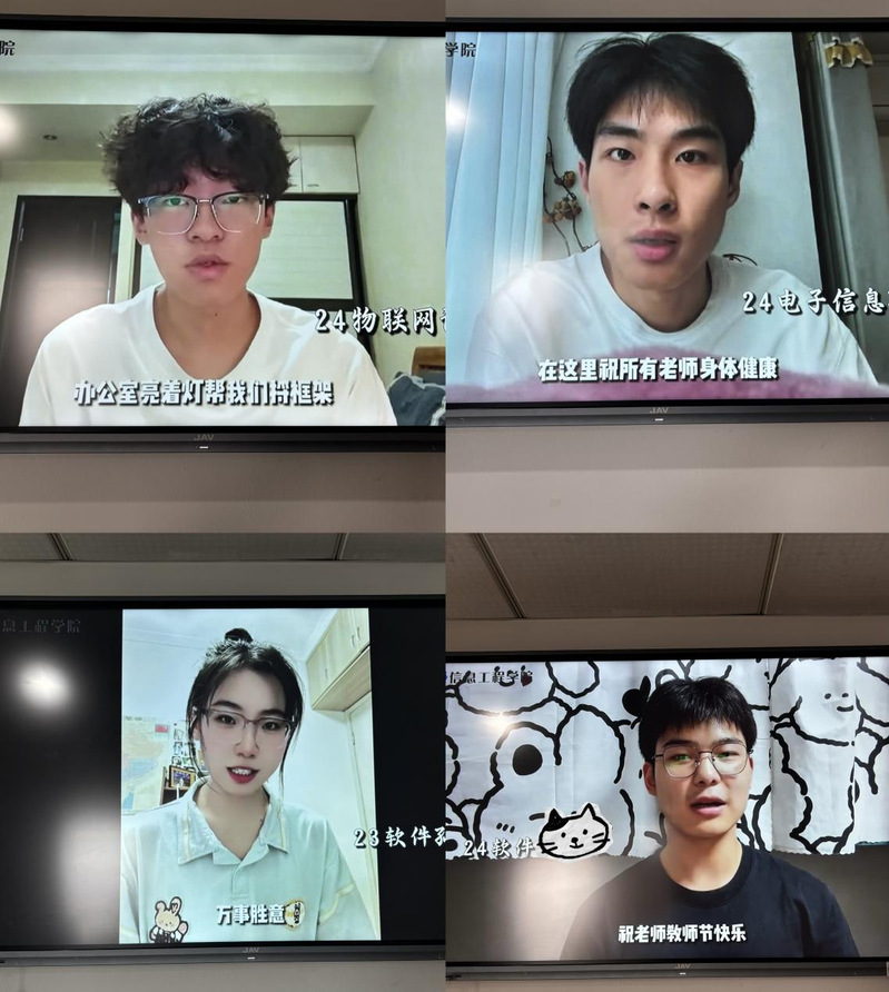 学院于节前面向全院学生发起主题祝福视频征集活动。同学们用镜头记录下对教师的感激之情、课堂趣事与成长点滴。在教师节座谈会现场暨学院办公区域进行循环播放。画面中,同学们真挚的笑脸和朴实动情的话语,深深打动了在场的每一位老师。视频虽短,情意绵长,同学们真诚的祝福和动人的回忆,令许多老师热泪盈眶,倍感欣慰,进一步激发教书育人的内生动力,营造团结向上、温馨和谐的学院文化。