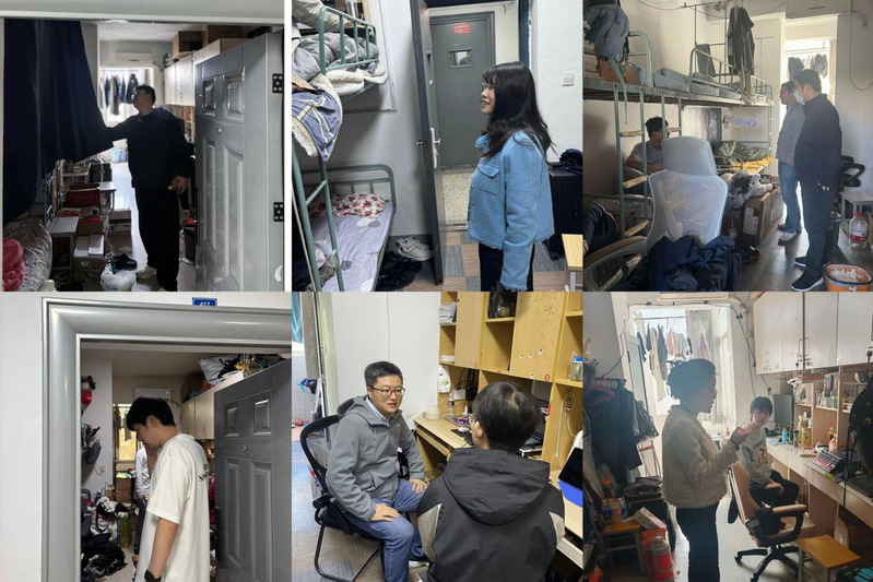 9月13日至10月23日,校领导带队,院领导、辅导员代表陪同,深入学生宿舍开展实地走访调研。走访组一行细致查看宿舍卫生清洁、物品摆放、安全用电、设施维护等情况,与学生代表面对面亲切交流,详细询问生活需求、学业进展及对宿舍管理的意见建议。针对部分宿舍存在的收纳整理不规范、安全防范意识薄弱等问题,现场提出针对性整改建议;针对学生反映的生活服务保障诉求,逐一记录并建立台账,明确责任分工与办结时限。领导班子带头下沉一线、靠前指挥,既传递了学校对学生成长的关怀关爱,也为创建工作精准施策、靶向发力提供了第一手资料,推动管理服务与学生需求精准对接。