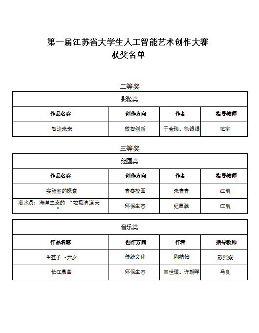 近日,省教育厅公布《第一届江苏省大学生人工智能艺术创作大赛获奖名单》,我校学生作品从全省1585件作品中脱颖而出,斩获奖项5项,其中,二等奖1项,三等奖4项,1件作品入围现场展览。