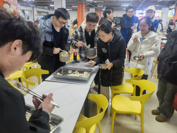 活动现场早已备好新鲜食材,洁白的面皮薄如蝉翼,猪肉白菜的鲜香、荠菜猪肉的清爽等馅料色泽诱人,工具摆放整齐。师生们围桌而坐,撸起袖子投入这场“美食创作”,随着时间的推移,越来越多的老师和同学加入到包饺子的队伍中,擀皮声、调馅声与欢声笑语交织。一个多小时的忙碌后,案板上整齐码放的饺子蔚为壮观。食堂工作人员即刻开锅煮饺,不一会儿,热气腾腾的饺子便冒着氤氲水汽上桌,皮薄馅足,咬下一口鲜汁迸发。师生围坐同食,舌尖萦绕的是美食的醇厚,心底涌动的是集体的温暖。“这是第一次和老师一起动手包饺子,感觉特别亲切,校园就像第二个家!”学子们的眼中满是欣喜;老师们也深有感触:“这样的活动跳出了课堂的框架,让我们看到了学生更鲜活的一面,师生情谊在烟火气中愈发深厚。”饺子煮好后,同学们主动提议分装打包,送至仍在岗位辛勤工作的门卫与宿管阿姨手中,让这份冬日的温暖传递至校园每一个角落。