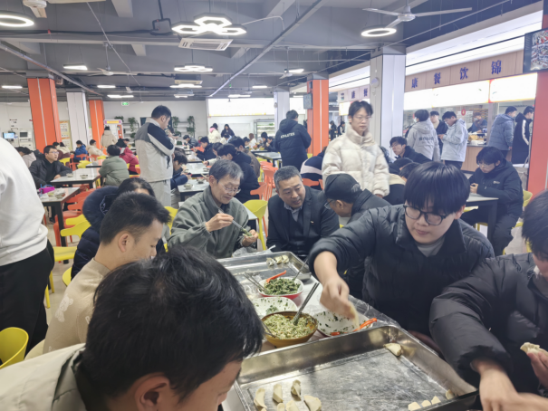 活动现场早已备好新鲜食材,洁白的面皮薄如蝉翼,猪肉白菜的鲜香、荠菜猪肉的清爽等馅料色泽诱人,工具摆放整齐。师生们围桌而坐,撸起袖子投入这场“美食创作”,随着时间的推移,越来越多的老师和同学加入到包饺子的队伍中,擀皮声、调馅声与欢声笑语交织。一个多小时的忙碌后,案板上整齐码放的饺子蔚为壮观。食堂工作人员即刻开锅煮饺,不一会儿,热气腾腾的饺子便冒着氤氲水汽上桌,皮薄馅足,咬下一口鲜汁迸发。师生围坐同食,舌尖萦绕的是美食的醇厚,心底涌动的是集体的温暖。“这是第一次和老师一起动手包饺子,感觉特别亲切,校园就像第二个家!”学子们的眼中满是欣喜;老师们也深有感触:“这样的活动跳出了课堂的框架,让我们看到了学生更鲜活的一面,师生情谊在烟火气中愈发深厚。”饺子煮好后,同学们主动提议分装打包,送至仍在岗位辛勤工作的门卫与宿管阿姨手中,让这份冬日的温暖传递至校园每一个角落。